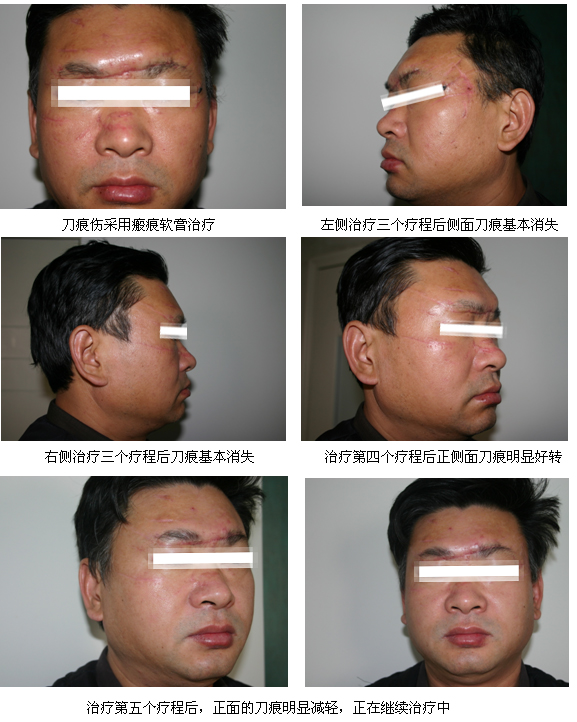 病例二:程某 ,男 ,27歲,農(nóng)民 。該患2010年2月誤被刀砍傷面部,傷口愈合后刀痕明顯,無(wú)法面對(duì)正常生活,逐產(chǎn)生輕生念頭。家人四處求醫(yī)為其治療,效果都不理想。2010年8月10日,該患接受河南大學(xué)附屬南石醫(yī)院采用原位再生醫(yī)療技術(shù)治療,治療效果滿意。如下圖。