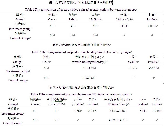 采用常規(guī)碘酒、酒精消毒創(chuàng)面,術(shù)區(qū)局部用0.5%利多卡因生理鹽水溶液浸潤麻醉,然后用雙波長脈沖調(diào)Q激光(長春光機(jī)所生產(chǎn)的YQ400-A/BI)進(jìn)行治療,激光臨床參數(shù)的設(shè)定依據(jù)病變調(diào)整,激光的波長、能量密度、光斑、脈寬和頻率應(yīng)根據(jù)患者的年齡、膚色、病變部位、病變顏色進(jìn)行設(shè)定;本激光有532 nm和1064 nm兩個波長。激光治療完畢后,按照皮膚原位再生醫(yī)療技術(shù)進(jìn)行創(chuàng)面處理:不使用刺激性消毒液,用無菌生理鹽水清洗干凈。然后治療組采用美寶濕潤燒傷膏外涂,可用壓舌板或棉簽將其均勻涂抹于創(chuàng)面,厚1 mm~2 mm,4 h~6 h換藥1次,每次涂藥前將創(chuàng)面殘留的藥物和滲出物清除干凈,可先用無菌生理鹽水清洗創(chuàng)面,然后涂美寶濕潤燒傷膏,應(yīng)時刻保持創(chuàng)面呈濕潤狀態(tài),防止創(chuàng)面結(jié)痂,直至創(chuàng)面愈合。對照組采用1%紅霉素軟膏外涂(涂藥厚度、換藥時間、創(chuàng)面清洗等和治療組相同),直至創(chuàng)面愈合。兩組均觀察記錄創(chuàng)面愈合時間、術(shù)后疼痛情況,并隨訪6個月至9個月,觀察創(chuàng)面色素沉著情況。創(chuàng)面愈合后叮囑患者注意防曬,以避免色素沉著,同時服用維生素c減輕色素沉著。