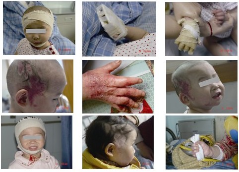Figure 1~2  The pressure bandage on head putting stress on the scar, bandage on patients hand with splintage to prevent the scar hypertrophy and maintain the hand configuration  Figure3 Individual bandaging for the fingers  Figure 4 After unwrapping the dressings, the level of scar is the same as the surrounding skin surface. With the application of massage and bandage therapy, the lesions appear between the fingers without contracture, and scar is soft  Figure5~6  Scar concentrated and shrunken after the application of microwave therapy  Figure 7  The bandage is still necessary after the microwave therapy  Figure 8~9  Recover well when the scars are treated for the 9th month