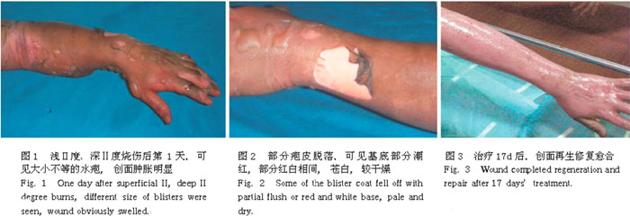 患者創(chuàng)面愈合較快,其中185例Ⅱ度電弧光燒傷創(chuàng)面全部提前愈合,其中淺Ⅱ度創(chuàng)面7d~14d,平均10.64d,深Ⅱ度創(chuàng)面16d~23d,平均18.25d。6例以Ⅲ度燒傷為主的患者均自行愈合,未行植皮手術(shù),41d~58d愈合,平均50.17d。創(chuàng)面換藥過程中,患者痛苦小,特別是在清除壞死組織時基本無痛苦。創(chuàng)面愈合后瘢痕少,皮膚功能無影響。隨機對18例雙上肢深Ⅱ度燒傷患者隨訪半年,只有個別病例出現(xiàn)色素沉著,愈合創(chuàng)面皮膚均光滑平整,彈性良好,且不影響皮膚美觀,功能良好(見圖1~3)。