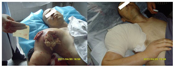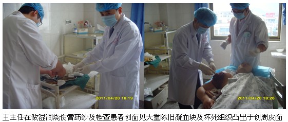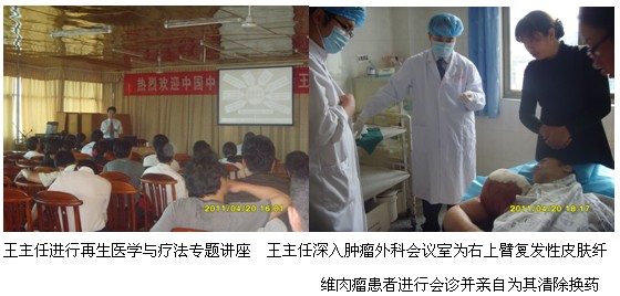會(huì)后在腫瘤外科及醫(yī)務(wù)科姜主任的邀請(qǐng)下王主任來(lái)到了腫瘤外科為一位右上臂復(fù)發(fā)性皮膚纖維肉瘤患者會(huì)診,該患者在該醫(yī)院進(jìn)行了惡性腫瘤根治手術(shù)后發(fā)生局部轉(zhuǎn)移,后又到云南省某腫瘤醫(yī)院進(jìn)行了第二次腫瘤切除術(shù),但術(shù)后手術(shù)切口不愈并向周圍潰爛,創(chuàng)面惡化而且腫塊更大,每次換藥時(shí)創(chuàng)面出血不止,以至主管醫(yī)生不敢給患者創(chuàng)面進(jìn)行清創(chuàng)換藥,該醫(yī)院束手無(wú)策讓患者出院,王主任給患者查體時(shí)發(fā)現(xiàn)其整個(gè)右上臂高度腫脹,無(wú)法抬起,連頭都向右傾,患者非常痛苦,面色蒼白,經(jīng)初步檢查后王主任親自為患者進(jìn)行清創(chuàng)換藥,從患者創(chuàng)面中清除大量暗紫色陳舊凝血塊及大量液化壞死組織,創(chuàng)面周圍皮下組織完全液化壞死,形成巨大潛腔,部分皮膚因液化壞死組織未及時(shí)清除積聚皮下高度擴(kuò)張而發(fā)生散在性壞死并即將潰破,隨著大量壞死組織及陳舊凝血塊被清除,創(chuàng)面及創(chuàng)腔得到減壓,創(chuàng)面及潛腔放置美寶濕潤(rùn)燒傷膏藥藥紗做引流清創(chuàng)及壓迫止血作用后創(chuàng)面出血及滲血停止,看著患者的表情由開始的痛楚逐漸變得輕松起來(lái),把在場(chǎng)的醫(yī)護(hù)人員都看得目瞪口呆,對(duì)再生醫(yī)療技術(shù)贊不絕口。他們沒(méi)想到在權(quán)威的省腫瘤醫(yī)院那些專家們都無(wú)從下手又給推到他們的基層醫(yī)院,而運(yùn)用再生醫(yī)療技術(shù)在短短的一個(gè)多小時(shí)就解決了一換藥就出血,并把腫塊減到最小,讓患者如釋重負(fù)了。