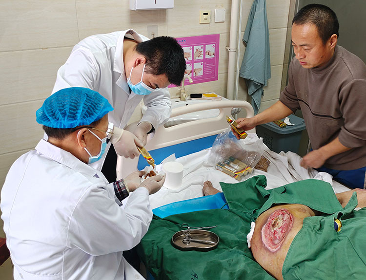 2月25日,受永興縣中醫(yī)醫(yī)院外二科何利軍主任的邀請(qǐng),《中國(guó)燒傷創(chuàng)瘍雜志》編委、燒傷創(chuàng)瘍?cè)偕t(yī)療技術(shù)臨床專家金黨軍,到科室參加科室查房、會(huì)診多名創(chuàng)瘍患者,為醫(yī)護(hù)人員培訓(xùn)并進(jìn)行了交流,之后親自示范再生醫(yī)療技術(shù)換藥流程。金主任還與骨科,內(nèi)分泌科主任們一起探討后期永興縣創(chuàng)面修復(fù)與再生醫(yī)療聯(lián)盟建設(shè)和聯(lián)盟技術(shù)指導(dǎo)單位的醫(yī)護(hù)人員學(xué)習(xí)培訓(xùn),旨在將再生醫(yī)療技術(shù)在永興縣基層醫(yī)療單位逐步普及和應(yīng)用,為廣大燒傷創(chuàng)瘍患者帶來(lái)福音。