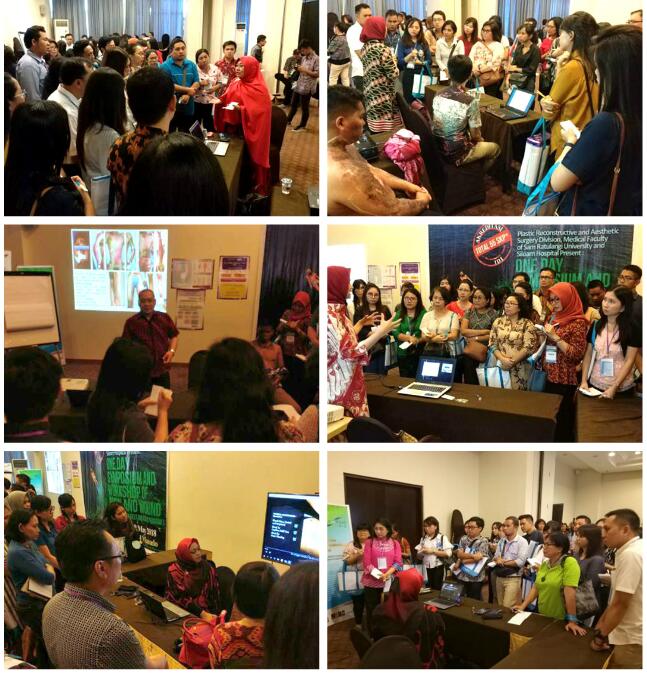 會(huì)議中,來自雅加達(dá)的Dr. Vika Tania/Dr. Afriyanti Sandhi/Dr. Aditya Herwandar講解了燒傷創(chuàng)瘍?nèi)梭w復(fù)原的基本理論; Dr. Aditya Herwandar/Dr. Donna Savitry/Dr. Puri Ambar Lestari則就創(chuàng)瘍的再生醫(yī)學(xué)基本護(hù)理進(jìn)行了闡述;Dr. Donna Savitry/Dr. Laksmi Achyati/Dr. Afriyanti Sandhi則以再生醫(yī)學(xué)燒傷的基本護(hù)理為主題展開論述;而Dr. Vika Tania/Dr. Puri Ambar Lestari則通過燒傷病例的分享讓大家更好的了解這一技術(shù);Dr. Mendy H.Oley/Dr. Maximillian Ch.Oley則分享了治療過程中控制疼痛的方法。隨后在場200余位參會(huì)者分六組進(jìn)行了討論,以燒傷在不同場景和情況下的急救措施和后續(xù)護(hù)理為重點(diǎn)進(jìn)行了熱烈的交流。