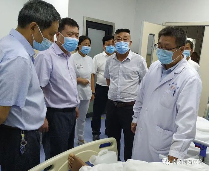 2020年8月19日,第三個“中國醫(yī)師節(jié)”,美寶集團總裁楊智斌、醫(yī)療部主任楊軍及美寶河南省總經(jīng)理趙俊國等在南石醫(yī)院院長趙俊祥、副院長李天宇陪同下來到南石醫(yī)院燒傷整形中心、難愈創(chuàng)面治療中心、康復中心等慰問臨床一線醫(yī)護工作者,看望重度燒傷、慢瘡患者,播撒愛心,情暖醫(yī)患。