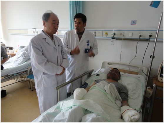張家港市燒傷創(chuàng)瘍治療基地揭牌儀式之后,中國中西醫(yī)結(jié)合學(xué)會(huì)燒傷專業(yè)委員會(huì)主任委員肖摩教授、趙瑞慶教授應(yīng)邀到燒傷科參觀指導(dǎo)工作。聽取錢明元主任的介紹,特別是應(yīng)用再生醫(yī)療技術(shù)治療殘余創(chuàng)面和疤痕等方面的經(jīng)驗(yàn)。并對(duì)住院的燒傷患者進(jìn)行了會(huì)診和病例分析討論。