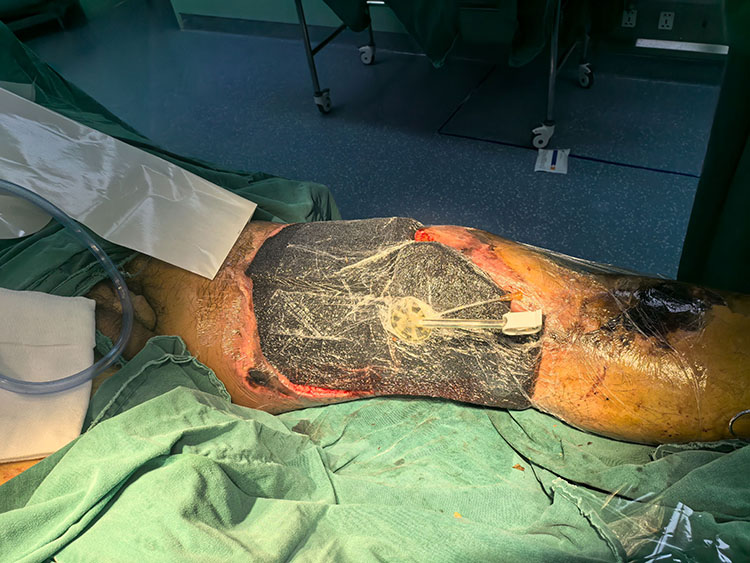 10月10日,應長治市人民醫(yī)院急診邀請,《中國燒傷創(chuàng)瘍雜志》常務編委、燒傷創(chuàng)瘍再生醫(yī)療技術臨床專家趙瑞慶,會診一例裝載機碾軋傷工人。次日在全麻下行雙下肢大腿內側,外側壞死組織清創(chuàng)術,事后使用vsd裝置,術后制定了詳細的治療方案。