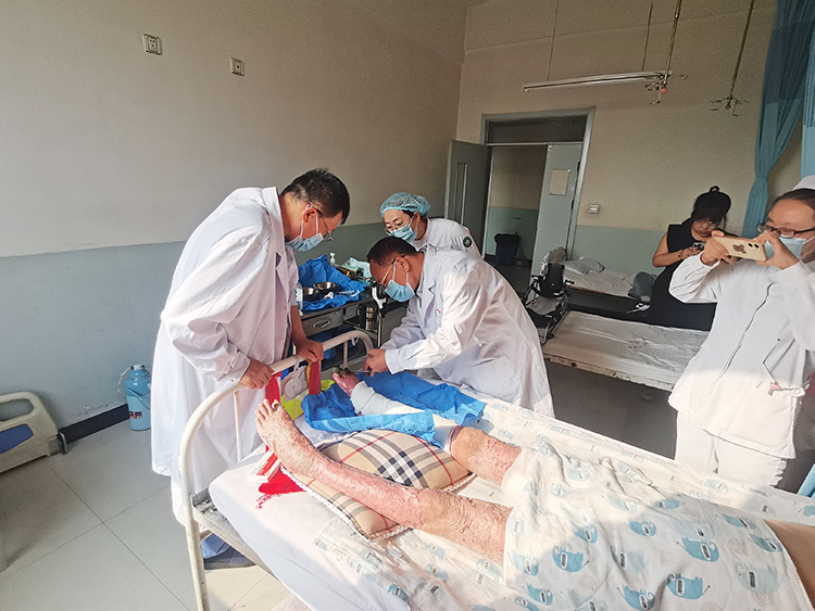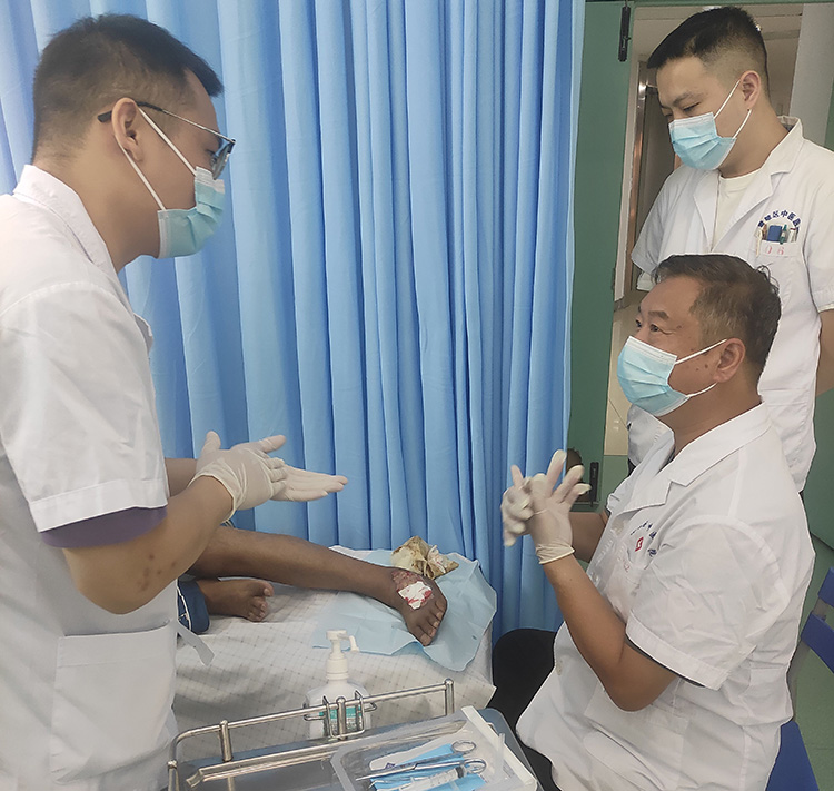 2024年9月22日, 應(yīng)黃江區(qū)中醫(yī)院外科葉峰主任邀請(qǐng),《中國(guó)燒傷創(chuàng)瘍雜志》編委、燒傷創(chuàng)瘍?cè)偕t(yī)療技術(shù)臨床專家張強(qiáng)來到該院會(huì)診,對(duì)一例腳部筋骨外露的透析患者現(xiàn)場(chǎng)示范換藥,講解換藥細(xì)節(jié),后與科室醫(yī)生就臨床中遇到的慢性創(chuàng)面的處理做了交流,此次活動(dòng)極大增進(jìn)了大家對(duì)再生醫(yī)療技術(shù)的了解,增強(qiáng)了運(yùn)用技術(shù)治療慢性創(chuàng)面的信心!