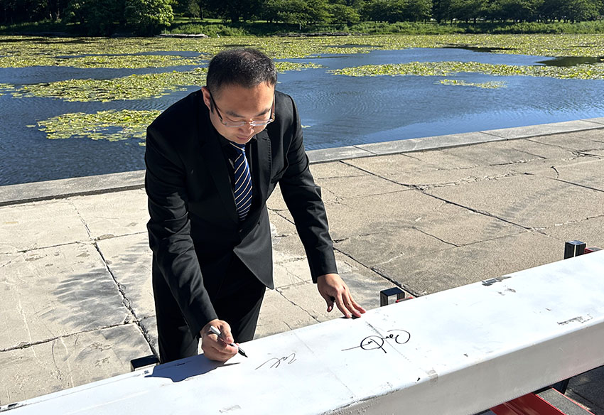當(dāng)?shù)貢r間2024年6月10日,美寶集團(tuán)董事局主席徐鵬受邀在備受矚目的奧巴馬總統(tǒng)中心施工現(xiàn)場的頂樓橫梁上簽下了自己的名字,這條橫梁將被置放于奧巴馬總統(tǒng)中心的最高點——博物館大樓的“天空屋”內(nèi)。這是繼奧巴馬總統(tǒng)本人之后,第二位在這座即將崛起的綜合性建筑上留下永恒印記的貢獻(xiàn)者。