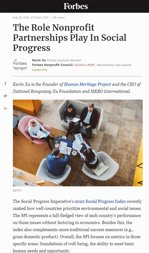 2021年8月16日,美寶集團(tuán)34周年紀(jì)念日,《福布斯》特別刊發(fā)美寶集團(tuán)董事局徐鵬文章——非營利伙伴關(guān)系在社會(huì)進(jìn)步中的作用。徐鵬希望通過非營利組織,提高國家的社會(huì)進(jìn)步指數(shù)(SPI)。