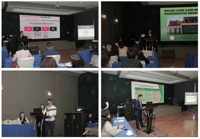 首先,來自中心醫(yī)院科研中心的Dr. Gantulga 主任就應(yīng)用濕潤燒傷膏結(jié)合植皮手術(shù)治療創(chuàng)傷、電燒傷、凍傷等進(jìn)行了講解;隨后Dr.  Amarsanaa對宮頸糜爛、宮頸外翻的患者進(jìn)行了對照研究,分享了濕潤燒傷膏結(jié)合錐形切除術(shù)的臨床效果;Dr. Jimsee講解了糖尿病足患者使用濕潤燒傷膏治療的效果;Dr. Urantsetseg針對兒科濕疹感染等疾病,講解了濕潤燒傷膏具有抑制色素沉著、抑菌等效果;Dr. Narantungalag分享了大面積、深度燒傷的治療經(jīng)驗;Dr. Uuganbayar重點介紹了硫酸鎂外滲導(dǎo)致皮膚損傷等案例;Dr. Munkhbayar通過面部及下肢凍傷案例,重點講解了濕潤燒傷膏在抑制瘢痕形成方面的效果;Dr. Tuya進(jìn)行了針對MRSA感染的膿腫的治療演講;Dr. Nurbol進(jìn)行了蜂窩組織炎治療的臨床治療經(jīng)驗分享;Dr. Tumenjargal根據(jù)糖尿病患者、感染MRSA患者對照試驗,講解了濕潤燒傷膏結(jié)合膿腫切除術(shù)的臨床治療效果,同時分享了患者在疫情期間根據(jù)醫(yī)生遠(yuǎn)程指導(dǎo)使用濕潤燒傷膏完成后期治療的案例;Dr. Saranchimeg根據(jù)高齡糖尿病患者,分享了在不便手術(shù)的情況下使用濕潤燒傷膏治療的臨床治療經(jīng)驗。