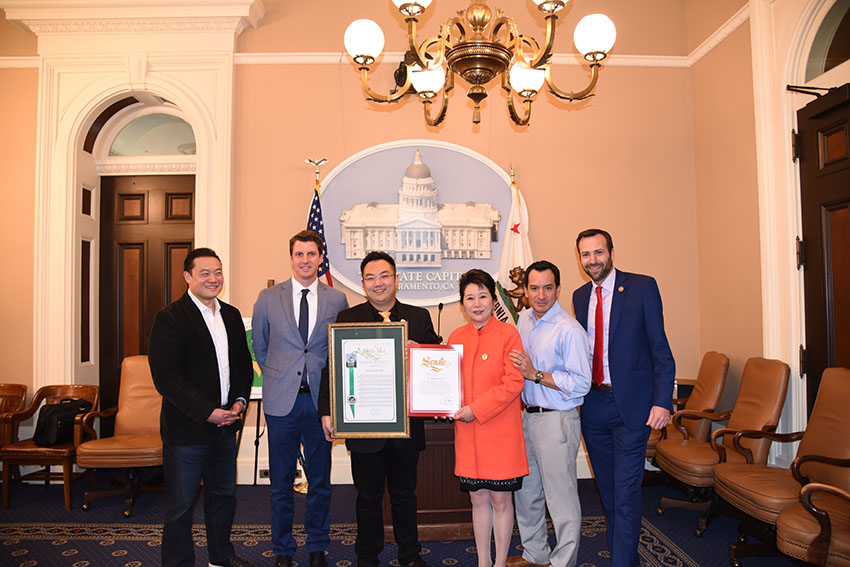 加州眾議院議長(zhǎng)蘭登先生(右二)和參議院教育委員會(huì)主席艾倫先生(右一)向?qū)W會(huì)總裁徐鵬(左三)和徐榮祥基金會(huì)主席李俐(右三)頒發(fā)賀狀