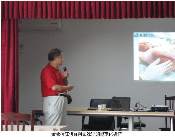 該院外科主任主持了學(xué)術(shù)會議,在學(xué)術(shù)講座中,金教授首先介紹了著名生命科學(xué)家、醫(yī)學(xué)家、人體再生復(fù)原科學(xué)的創(chuàng)立者、再生復(fù)原療法的發(fā)明人徐榮祥教授近年來在再生醫(yī)學(xué)領(lǐng)域所取得的重大實(shí)驗(yàn)及臨床研究成果,而后金教授結(jié)合了大量的臨床病例圖片,重點(diǎn)講述了原位再生復(fù)原技術(shù)的臨床操作規(guī)范,原位再生復(fù)原技術(shù)在創(chuàng)傷,褥瘡,潰瘍等多學(xué)科的應(yīng)用,并從燒傷創(chuàng)面治療難題的再生復(fù)原機(jī)理、解決深度創(chuàng)面的愈合難題機(jī)理、創(chuàng)傷創(chuàng)面治療難題再生復(fù)原機(jī)理、糖尿病潰瘍的再生復(fù)原機(jī)理、組織肢體缺損的復(fù)原機(jī)理皮膚器官原位復(fù)原再生的機(jī)理、瘢痕組織的預(yù)防和處理等幾個方面以大量的病例對人體器官原位再生復(fù)原技術(shù)進(jìn)行了深入淺出的講解。