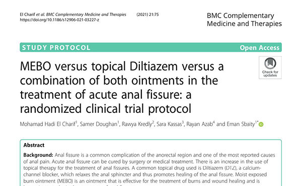 肛裂是肛門直腸區(qū)域常見并發(fā)癥,也是最常見的肛門疼痛原因之一。急性肛裂可以通過手術(shù)或藥物治愈。本次對比試驗(yàn)旨在評估美寶濕潤燒傷軟膏(MEBO)在治療急性肛裂方面的療效和安全性,并與治療肛裂的常見局部用藥地爾硫(Diltiazem)進(jìn)行比較研究。美寶濕潤燒傷軟膏作為一種有效治療燒傷創(chuàng)瘍的軟膏,在肛裂治療中受到越來越多的關(guān)注和廣泛應(yīng)用。該試驗(yàn)將產(chǎn)生關(guān)于使用植物藥/天然產(chǎn)品MEBO軟膏治療肛裂的循證結(jié)論,通過對首次進(jìn)入世界臨床醫(yī)療體系的中國植物外用藥MEBO的多學(xué)科應(yīng)用進(jìn)行進(jìn)一步的臨床評估。