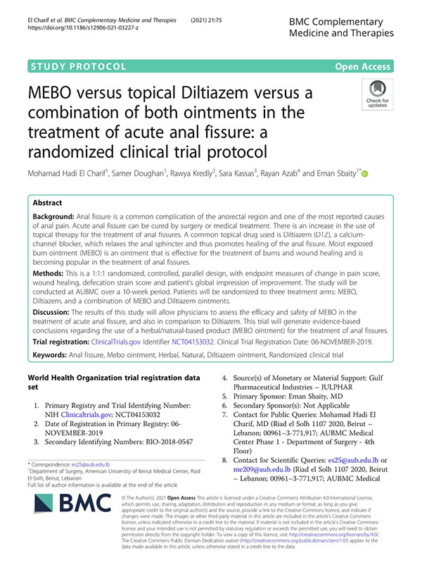 日前,一項(xiàng)由貝魯特美國大學(xué)醫(yī)學(xué)中心醫(yī)學(xué)博士、首席研究員Eman Sbaity發(fā)起的MEBO與Diltiazem兩種軟膏制劑在急性肛裂治療中的對比試驗(yàn)研究方案在BMC Complementary and Alternative Medicine(BMC補(bǔ)充與替代醫(yī)學(xué))雜志發(fā)表。該研究方案已在世界衛(wèi)生組織WHO試驗(yàn)注冊數(shù)據(jù)集備案,以為該研究方案提供信息存檔、訪問查詢、進(jìn)展追蹤及研究評估等。