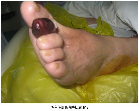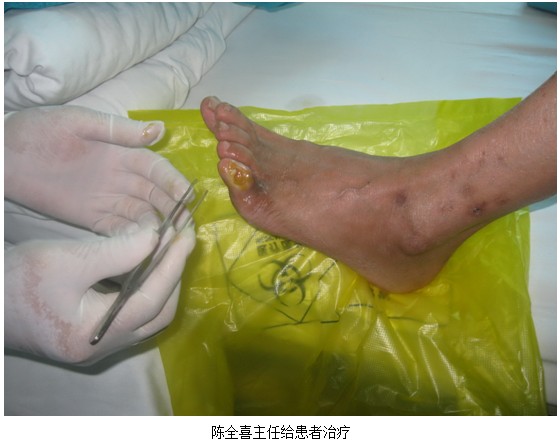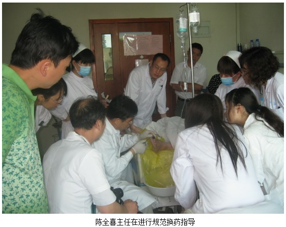 2012年6月8號(hào)上午,中國(guó)中西醫(yī)結(jié)合學(xué)會(huì)燒傷專業(yè)委員會(huì)委員、北京美寶燒傷創(chuàng)瘍研究所臨床技術(shù)部推廣專家陳全喜主任應(yīng)河南鄭州大學(xué)第一附屬醫(yī)院內(nèi)分泌二科孫教授的邀請(qǐng),會(huì)診兩位患糖尿病足潰瘍創(chuàng)面病人,進(jìn)行臨床規(guī)范換藥示范。隨后陳全喜主任又對(duì)全科人員進(jìn)行膚原位再生醫(yī)療技術(shù)培訓(xùn)。