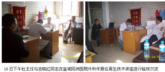 4月19日下午杜福勤主任和吉曉紅同志在鹽城同洲醫(yī)院外科作原位再生技術(shù)在燒傷創(chuàng)傷潰瘍創(chuàng)面中的臨床實踐講座,并對臨床的實際遇到的問題進行了交流,結(jié)合臨床面對面的交流溝通,受到良好的效果。