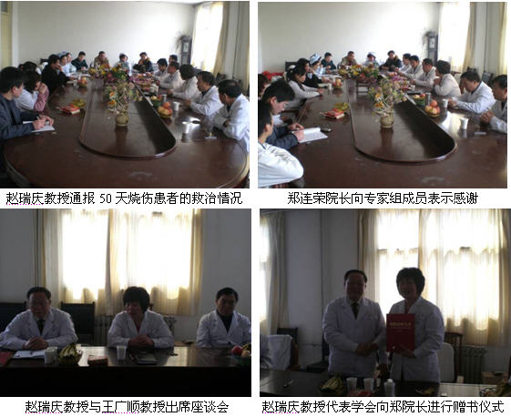 最后,趙瑞慶教授還代表了中國中西醫(yī)結(jié)合學會燒傷專業(yè)委員會、北京燒傷創(chuàng)瘍研究所、中國燒傷創(chuàng)瘍雜志社向鄭連榮院長贈送了《燒傷治療大全》一部,會后趙瑞慶教授與王廣順教授一同看望了患者及患者家屬。