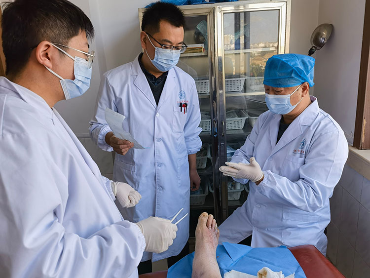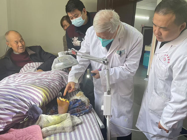 2024年11月27日,《中國(guó)燒傷創(chuàng)瘍雜志》編委、燒傷創(chuàng)瘍?cè)偕t(yī)療技術(shù)臨床專(zhuān)家張強(qiáng)應(yīng)?邀來(lái)到潛山市立醫(yī)院?,對(duì)該院收治的一名糖尿病足患者進(jìn)行查看會(huì)診,進(jìn)行創(chuàng)面清創(chuàng)、擴(kuò)創(chuàng)以及對(duì)治療方案給予指導(dǎo),受到醫(yī)患雙方一致好評(píng)!
