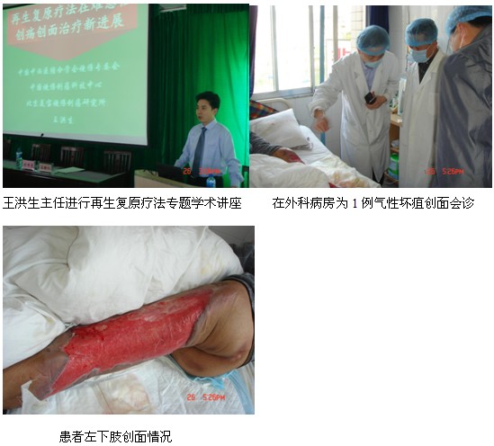 在學(xué)術(shù)講座中,王教授首先向與會醫(yī)護(hù)人員介紹了我國著名生命科學(xué)家、醫(yī)學(xué)家徐榮祥教授在人體再生復(fù)原科學(xué)領(lǐng)域取得的實驗及臨床研究最新進(jìn)展,在2010年年底公布的“人體生命延續(xù)之謎(二)——線粒體主導(dǎo)日常生命”,破解了“精、氣、神、力”旺盛與人體啟動了再生生命程序有關(guān),與細(xì)胞內(nèi)各主要細(xì)胞器功能的發(fā)揮有關(guān),并進(jìn)一步證實了一個生命體可以同時具有“基本生命”和“再生生命”等,然后結(jié)合了大量的臨床病例圖片,主要針對不同深度的燒傷創(chuàng)面及各類難愈性創(chuàng)傷、潰瘍創(chuàng)面的規(guī)范化處理方法與技巧、注意事項及其各種原因引起的骨外露的治療方案等進(jìn)行了細(xì)致地講解,并用向?qū)W員展示了糖尿病足創(chuàng)面規(guī)范處理的錄像,并且詳細(xì)解答了醫(yī)護(hù)人員提出的各種提問。學(xué)術(shù)講座一直持續(xù)到當(dāng)日下午17:00時才結(jié)束。隨后該院外科肖渝主任又邀請王洪生教授到該院外科病房為1例左下肢氣性壞疽合并的難愈性創(chuàng)面進(jìn)行會診,指導(dǎo)下一步創(chuàng)面修復(fù)方法和措施。