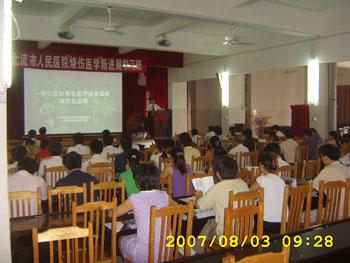 開幕式結(jié)束后,學(xué)術(shù)講座開始,王洪生主任采用多媒體教學(xué)方式,利用大量詳實的圖片資料,一是重點向與會的醫(yī)護人員講述了燒傷發(fā)展史及國內(nèi)外燒傷治療現(xiàn)狀,同時重點講述了了我國著名生命科學(xué)家,醫(yī)學(xué)家徐榮祥教授近年來在生命再生科學(xué)及燒傷再生醫(yī)學(xué)領(lǐng)域所取得的研究新進展和重大實驗和臨床研究成果;并通報了徐榮祥教授在生命科學(xué)研究領(lǐng)域于2005年12月6日在美國獲得的三大發(fā)明專利;二是重點講述了燒傷皮膚原位再生醫(yī)療技術(shù)在燒傷臨床中的規(guī)范化應(yīng)用;三是重點講述了燒傷皮膚原位再生醫(yī)療技術(shù)在多學(xué)科的臨床應(yīng)用。學(xué)術(shù)講座結(jié)束前,還進行了互動式大會交流及提問,王洪生主任對學(xué)員提出的問題一一進行了解答。