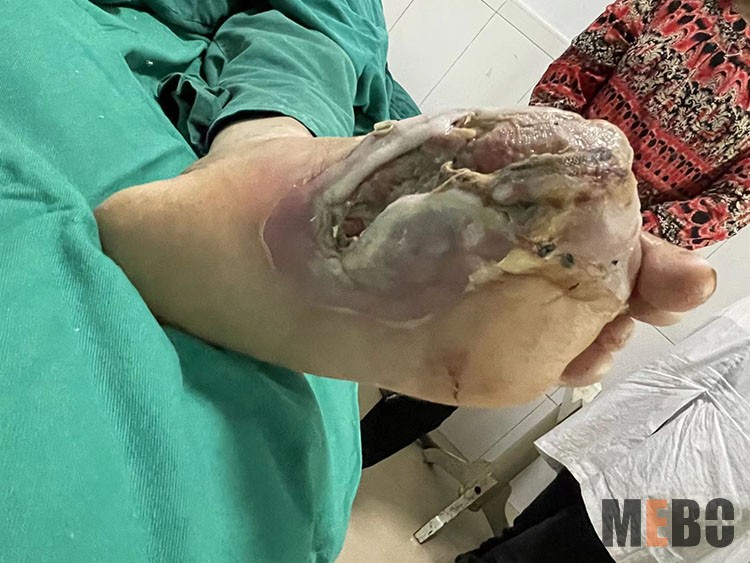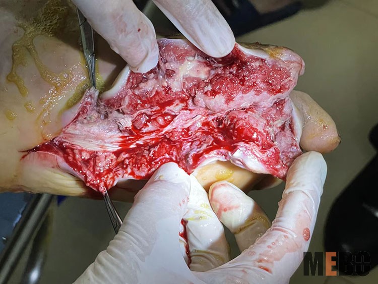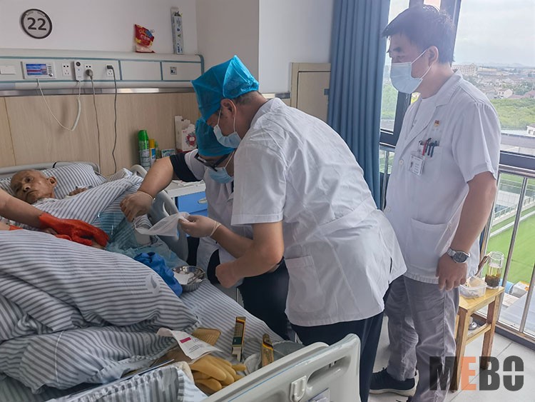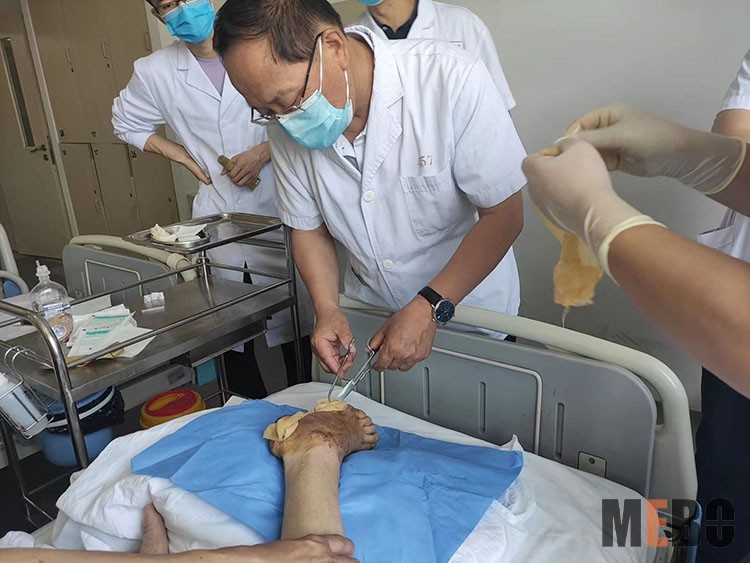 2022年6月23日,應(yīng)南通市第四人民醫(yī)院之邀,再生醫(yī)學(xué)知名專家、《中國燒傷創(chuàng)瘍雜志》常務(wù)編委趙瑞慶主任在該院會診了1例老年女性患者,患者有十年糖尿病史,左足感染2月余,外院治療加重合并創(chuàng)面深部感染,趙主任現(xiàn)場進(jìn)行了引流、清理壞死組織、加用電介質(zhì)、美寶紗布填塞等規(guī)范操作,還制定了治療計劃,受到當(dāng)?shù)蒯t(yī)務(wù)人員的稱贊!
