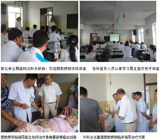 會議結束后,應普外科張主任邀請,樊兆宗教授來到病房會診了兩例患者:一例褥瘡病人,另一例為腹部難愈合創(chuàng)面,產(chǎn)生竇道,樊教授結合病人情況再次講解了如何運用再生醫(yī)療技術來進行規(guī)范治療。本次學術活動對再生醫(yī)療技術在敦化林業(yè)局職工醫(yī)院的推廣工作打下了堅實的基礎。