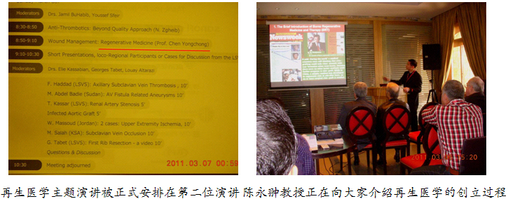 2011年3月6日上午8時30份,進行了簡短的開幕儀式后,便進入到主題演講階段。參加這次黎巴嫩血管外科大會的有來自黎巴嫩、敘利亞、蘇丹、伊拉克的血管外科專家60多名,這些都是各國、各醫(yī)院的血管外科主任、學科帶頭人和資深的專家。再生醫(yī)學演講被安排在大會第二位發(fā)言,由黎巴嫩血管外科學會主席、美國大學貝魯特醫(yī)院血管外科主任Dr. Fady Baddad教授主持,陳永翀代表徐榮祥教授以“The Clinical Application Effect of Burns Regenerative Medicine in Treating Refractory Wounds”(燒傷再生醫(yī)學治療難愈合創(chuàng)面的臨床應用效果)”為題做了精彩的演講,演講內(nèi)容包括:1、徐榮祥教授與燒傷再生醫(yī)學的創(chuàng)立及臨床治療大面積燒傷的情況簡介;2、難愈合創(chuàng)面的定義與分類;3、再生醫(yī)學在難愈合創(chuàng)面的臨床治療效果與典型病例;4、再生醫(yī)學的創(chuàng)面治療原則與換藥規(guī)范。陳教授以通俗、簡練、易懂的語言向參會的專家們講解了燒傷再生醫(yī)學的發(fā)明與實現(xiàn)燒傷創(chuàng)面的再生愈合機理,以圖文并茂的方式向大家展示了臨床治療效果,以嚴謹、認真的態(tài)度地向大家闡述了再生醫(yī)學的創(chuàng)面治療原則與換藥規(guī)范要求。再生醫(yī)學的演講深深吸引了大家的注意力,每位專家都聽得非常認真,討論階段大家更是踴躍萬分,會場氣氛非常熱烈,而陳教授帶來的《臨床手冊》、《中國燒傷創(chuàng)瘍雜志》、《創(chuàng)面治療規(guī)范》等再生醫(yī)學資料則被大家蜂擁而上“搶奪”一空,會場情況幾乎到了“失控”的狀態(tài),好在主持人巧妙地引導大家和建議大家在中午午飯時間還可以向陳教授咨詢,才使會議得以繼續(xù)進行下去??梢姶蠹覍υ偕t(yī)學的興趣和學習的熱情是非同一般,演講很受歡迎、反響非凡。