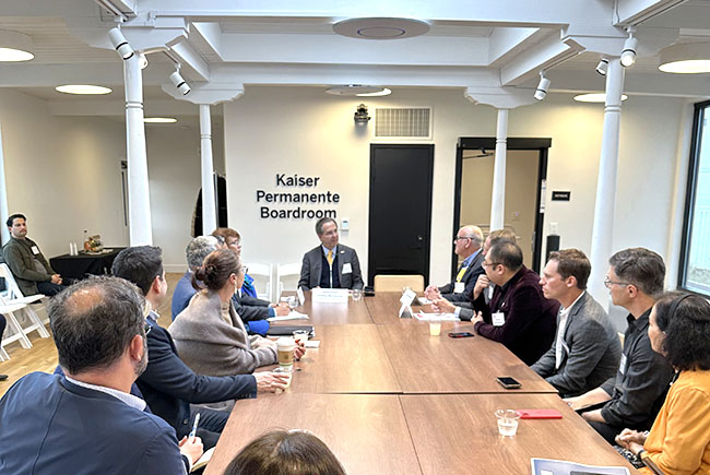 當(dāng)?shù)貢r間5月2日下午,在舊金山灣區(qū)委員會總部,美寶集團(tuán)董事局主席及灣區(qū)委員會執(zhí)行董事兼國際委員會共同主席徐鵬,與灣區(qū)委員會首席執(zhí)行官Jim Wunderman共同會見了到訪的墨西哥駐美大使Esteban Moctezuma Barragán 一行。參與會見的還有灣區(qū)委員會經(jīng)濟(jì)研究院高級主管、前院長Sean Randolph 等人。會談中徐鵬介紹了美寶國際今年啟動的與墨西哥瓜達(dá)拉哈拉人民醫(yī)院合作的燒傷臨床研究項目,并表示在生物科技方面美墨雙方有很廣闊的合作空間。大使表示墨西哥與灣區(qū)委員會有很多領(lǐng)域可以加強(qiáng)合作,Jim表示明年灣區(qū)委員會計劃組團(tuán)去墨西哥考察,加強(qiáng)雙邊合作。雙方并就2023 APEC會議墨西哥的工作準(zhǔn)備進(jìn)行了交流。Jim帶領(lǐng)大使一行上頂層甲板美寶花園游覽并觀賞了灣區(qū)景色。