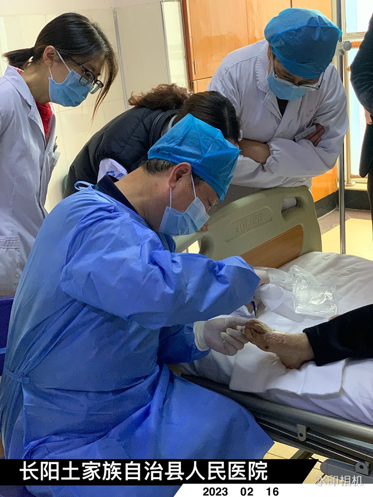 2023年2月16日,中國中西醫(yī)結(jié)合學(xué)會(huì)燒傷專業(yè)委員會(huì)醫(yī)療部張強(qiáng)主任和湖北省中醫(yī)師協(xié)會(huì)燒傷與創(chuàng)面修復(fù)專業(yè)委員會(huì)黃彥勇主任,共同走訪湖北宜昌長陽土家族自治縣人民醫(yī)院心胸甲乳燒傷科及內(nèi)分泌科,會(huì)診兩例燒傷患者和一例糖尿病潰瘍患者。其中腰部硫酸燒傷患者應(yīng)用再生醫(yī)療技術(shù)治療效果良好,張主任建議患者用腹帶固定,避免活動(dòng)脫落。另一例燒傷患者因在家處理不當(dāng)導(dǎo)致創(chuàng)面形成黑痂,張主任就剝痂術(shù)后換藥方法和注意事項(xiàng)向張磊醫(yī)師提供了中肯方案。糖尿病潰瘍患者張主任示范了竇道換藥小技巧和再生醫(yī)療技術(shù)規(guī)范換藥。此次交流醫(yī)師們又學(xué)習(xí)到很多臨床經(jīng)驗(yàn),紛紛向張主任表示誠摯感謝!會(huì)診結(jié)束,張強(qiáng)主任、黃彥勇主任同燒傷科劉勇主任深入探討燒傷慢創(chuàng)學(xué)科建設(shè)與發(fā)展趨勢(shì),劉主任希望在學(xué)會(huì)的關(guān)注指導(dǎo)扶持下,規(guī)范發(fā)展,實(shí)實(shí)在在造?;鶎永习傩?!