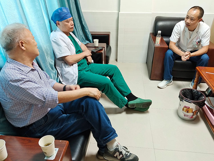 2023年6月12日,北京榮祥再生醫(yī)學研究所副所長、《中國燒傷創(chuàng)瘍雜志》編委金黨軍,應信豐縣人民醫(yī)院劉主任的邀請,來到該科室會診了3例病人,并親自對一例帶狀皰疹合并壓瘡的患者行了規(guī)范換藥,獲得了醫(yī)護人員以及病人家屬一致的認可,劉主任還就科室建設與大家進行了深入交流。下午,應贛南醫(yī)學院第二附屬醫(yī)院周院長的邀請,金黨軍來到該院同周院長和燒傷創(chuàng)面修復科何主任,就建立特色科室進行了深入交流,獲得大家一致認可。