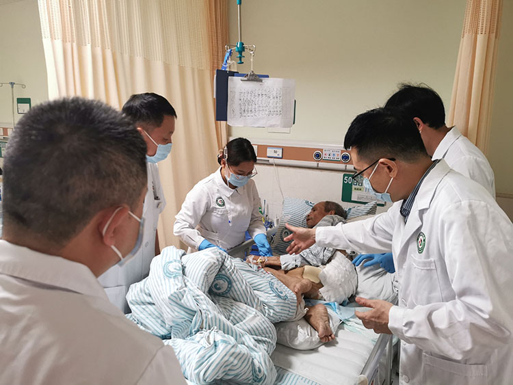 2023年6月20日,中國中西醫(yī)結(jié)合學會燒傷專業(yè)委員會張強主任,應荊州市第三人民醫(yī)院周明主任的邀請,再次對一例47%大面積燒傷病人進行查房會診。在聯(lián)合應用再生醫(yī)療技術規(guī)范換藥治療五天后,創(chuàng)面修復良好。根據(jù)患者創(chuàng)面恢復情況,張教授協(xié)助周主任對患者進行了換藥處理,周主任對患者的治療效果非常滿意,對張教授的精心指導表示感謝!本次通過聯(lián)合再生醫(yī)療技術對大面積燒傷病人的救治,周主任對再生醫(yī)療技術有了更深的了解,表示將會在今后的臨床工作中積極探索采用中西醫(yī)結(jié)合的方法聯(lián)合再生醫(yī)療技術對燒傷及慢創(chuàng)患者進行治療,造福荊城百姓!