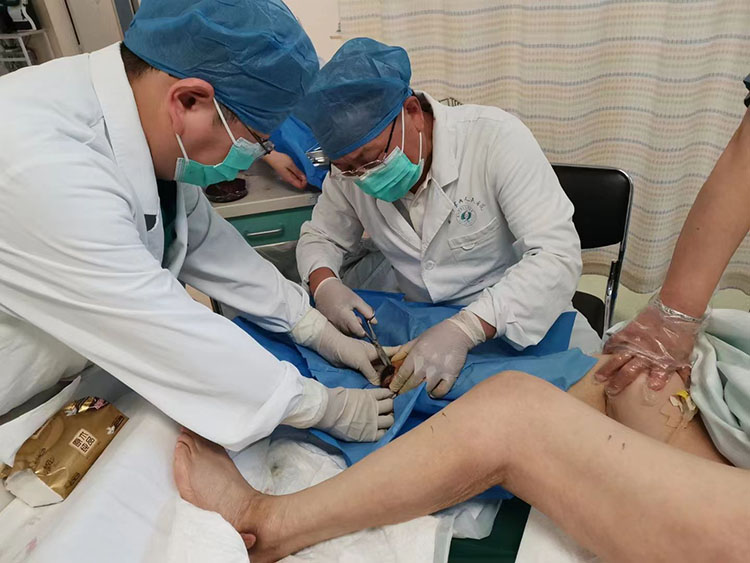 2023年6月13日,再生醫(yī)學知名專家、《中國燒傷創(chuàng)瘍雜志》常務編委趙瑞慶主任,應邀到蘇州市第九人民醫(yī)院急診ICU會診褥瘡患者,為患者探察腔隙、清創(chuàng)、規(guī)范換藥,邊操作邊講解注意事項,并對下一步的治療提出建議,得到急診外科金冬林主任及醫(yī)務人員真誠的感謝。隨后趙教授不辭辛苦,到吳江區(qū)中醫(yī)院深入科室傳經(jīng)送寶,給急診外科做再生醫(yī)療技術治療糖尿病足的專題講座,受到安主任及醫(yī)務人員的一致好評。