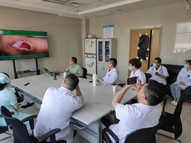 2023年6月16日,再生醫(yī)學知名專家、《中國燒傷創(chuàng)瘍雜志》常務編委趙瑞慶主任,如約到如東縣人民醫(yī)院給手足外科主任醫(yī)生及傷口造口護士做了《再生醫(yī)療技術治療壓瘡》的培訓交流活動。隨后在科主任的帶領下來到病房,會診了2例患者(1例左下肢外傷皮膚缺損,1例左踝部外傷感染),并分別給出了后期的治療方案,得到了醫(yī)護人員的肯定!
