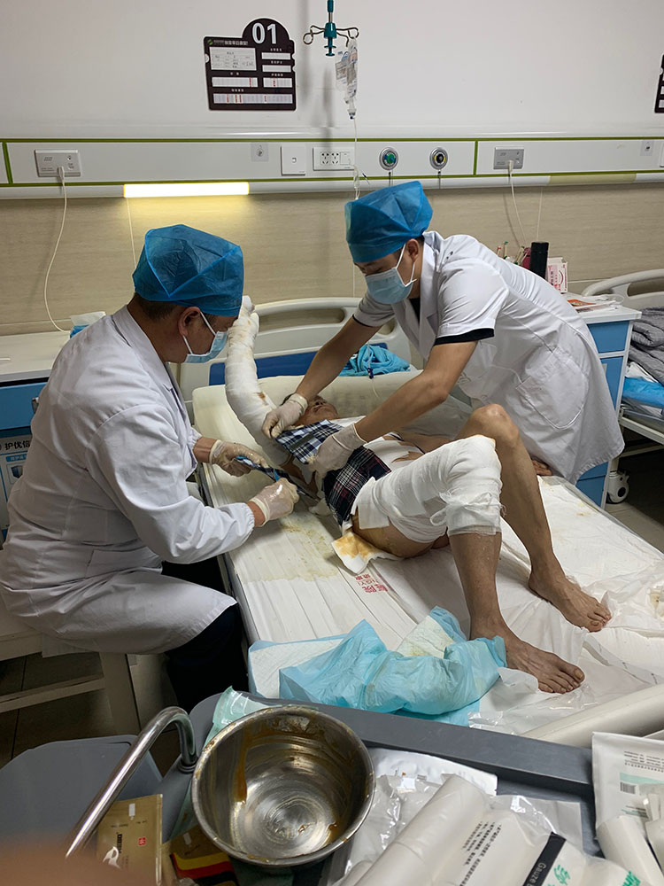 2023年6月15日,應荊州市第三人民醫(yī)院燒傷科周明主任的邀請,中國中西醫(yī)結(jié)合學會燒傷專業(yè)委員會醫(yī)療部張強主任,來到科室為一例大面積燒傷病人進行會診,應用再生醫(yī)療技術為患者進行治療。周明主任親自協(xié)同,與張強主任一起為患者進行清創(chuàng)換藥治療。