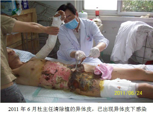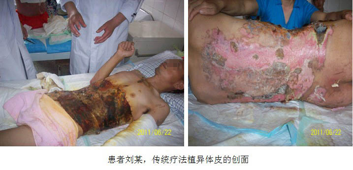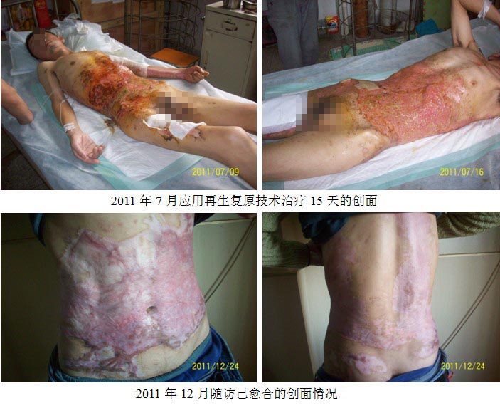 患者劉某回想起住院的那段日子,“經(jīng)濟困難壓得我們夫妻倆簡直喘不過氣來,幾次都想尋短見一走了之,傳統(tǒng)技術(shù)植皮已花掉近10萬元,創(chuàng)面又出現(xiàn)植過異體皮的下面感染,在這樣的情況下,北京專家杜福勤主任徹底清除了已感染的異體皮,應(yīng)用再生復(fù)原技術(shù)和MEBO濕潤燒傷膏治療為我精心治療,杜主任每天給我清創(chuàng)換藥,創(chuàng)面一天天日漸好轉(zhuǎn),一周后創(chuàng)面明顯縮小。當時杜主任有事去其它地方治療病人,走后第二天,醫(yī)院又將治療方法改成了傳統(tǒng)治療方法,朝創(chuàng)面上噴碘伏、用碘伏紗布覆蓋創(chuàng)面,疼得我簡直難以忍受,盼著杜主任早日回來給我治療,在我電話的不斷催促下,三四天后杜主任回到皖北總院重新給我恢復(fù)了再生復(fù)原技術(shù)治療,我真的是非常幸運。從應(yīng)用再生復(fù)原技術(shù)治療到全部創(chuàng)面愈合總共費用一萬元左右,不論從經(jīng)濟上還是自身痛苦度上來講,我都是一個極大的受益者,感謝北京燒傷研究所的杜主任!感謝再生復(fù)原技術(shù)!感謝再生復(fù)原技術(shù)發(fā)明人徐教授!”