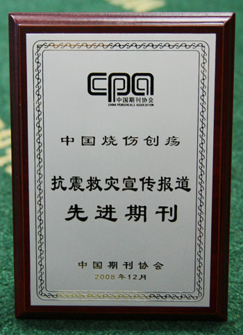 中國期刊協(xié)會為了表彰先進(jìn),于今年8月在全國期刊界開展了評選抗震救災(zāi)宣傳報道先進(jìn)期刊及先進(jìn)個人的活動,在經(jīng)過中宣部出版局、民政部、新聞出版總署有關(guān)部門的領(lǐng)導(dǎo)和業(yè)界專家組成的評審委員會進(jìn)行認(rèn)真評審后,決定授予106種期刊“全國抗震救災(zāi)宣傳報道先進(jìn)期刊”的榮譽稱號,《中國燒傷創(chuàng)瘍雜志》在全國九千多種期刊中涌現(xiàn)了出來,獲此殊榮。