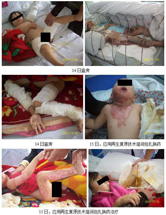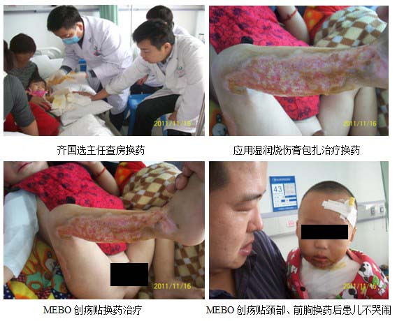 14日~17日,杜福勤主任再次來到燒傷科,在齊國(guó)選主任的帶領(lǐng)下看望了住院的燒傷和整形患者,并給予再生技術(shù)處理?yè)Q藥。15日給予示范換藥治療,得到患者及家屬的認(rèn)可和歡迎,特別是幼兒患者,應(yīng)用再生技術(shù)換藥后,患兒立即停止哭鬧;16日,應(yīng)用MEBO創(chuàng)瘍貼給頸胸部燙傷患兒和上下肢燒傷植過自體皮的患兒換藥治療,收到了良好的臨床效果。