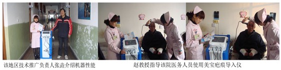 元月中旬剛開完北京總部2012年的工作會(huì)議后,中國(guó)燒傷瘡瘍研究所副所長(zhǎng)趙瑞慶教授了解到山西解放軍282醫(yī)院燒傷科趙興中主任在治療燒傷病人的基礎(chǔ)上,準(zhǔn)備在2012年開展治療疤痕項(xiàng)目。在地區(qū)再生醫(yī)學(xué)推廣負(fù)責(zé)人張垚的陪同下,乘車趕往駐地。趙教授向該院醫(yī)務(wù)人員認(rèn)真講解了美寶疤痕儀的機(jī)理、操作程序以及美寶疤痕軟膏的功能特點(diǎn),重點(diǎn)講解了臨床上常見的疤痕分類、疤痕形成的各種因素。采用美寶疤痕儀治療新鮮疤痕,陳舊疤痕的措施。現(xiàn)場(chǎng)親自指導(dǎo)該院醫(yī)務(wù)人員操作,直到完全掌握為止。