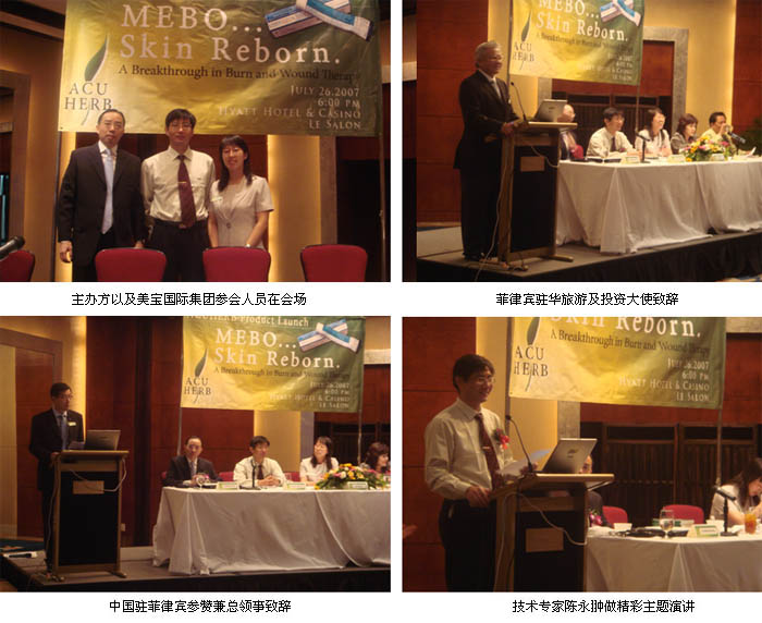 2007年7月26日晚19點(diǎn)半,美寶產(chǎn)品發(fā)布會(huì)于菲律賓馬尼拉最著名的Hyatt Hotel隆重召開(kāi)。此次發(fā)布會(huì)是美寶國(guó)際集團(tuán)在菲律賓的合作伙伴-菲律賓菲亞華公司向菲律賓人介紹美寶濕潤(rùn)燒傷膏的一個(gè)良好契機(jī)。參加此次產(chǎn)品發(fā)布會(huì)的有政界代表,如菲律賓駐華旅游及投資大使、中國(guó)駐菲律賓總領(lǐng)事、菲律賓眾議員;也有商界代表,如菲律賓最大的已具有62年?duì)I銷(xiāo)歷史的Mercury Drugs藥店的銷(xiāo)售經(jīng)理;還有來(lái)自菲律賓的著名醫(yī)院,例如菲律賓最大的菲律賓總醫(yī)院、馬尼拉市立醫(yī)院以及Manila Doctors Hospital 等9個(gè)醫(yī)院的70多個(gè)醫(yī)生代表;同時(shí)還有包括新華社、光明日?qǐng)?bào)、The Philippine Star、Philippine Daily Inquirer 等數(shù)家新聞媒體的代表。美寶國(guó)際集團(tuán)派出技術(shù)專家陳永羽中以及境外經(jīng)營(yíng)總部技術(shù)主管李曉輝參會(huì)。首先,菲亞華公司總裁鄭啟明先生致開(kāi)場(chǎng)辭,感謝大家參加這一第一個(gè)作為處方藥在菲律賓成功注冊(cè)的來(lái)自中國(guó)的藥品的發(fā)布會(huì)。菲律賓駐華旅游及投資大使做了熱誠(chéng)洋溢的演講,高度贊揚(yáng)了鄭先生在引進(jìn)中國(guó)的先進(jìn)藥品方面所做的巨大貢獻(xiàn),并提出,在菲律賓官方對(duì)中國(guó)食品藥品很不感冒的情況下,該產(chǎn)品發(fā)布會(huì)的順利舉行本身就是一個(gè)很大的成功,并祝賀美寶濕潤(rùn)燒傷膏成為第一個(gè)來(lái)自中國(guó)并在菲律賓成功注冊(cè)的處方藥。中國(guó)駐菲律賓參贊及總領(lǐng)事對(duì)于中國(guó)藥品所取得的成就感到驕傲,并聲明將更加支持中國(guó)醫(yī)藥在菲律賓的發(fā)展。技術(shù)專家陳永羽中做了關(guān)于燒傷皮膚再生醫(yī)學(xué)在燒傷、瘡瘍領(lǐng)域的應(yīng)用效果以及其他器官再生的實(shí)驗(yàn)室研究成果的精彩演講。與會(huì)人員全部聚精會(huì)神聽(tīng)講。大量醫(yī)生在會(huì)后找到主辦方以及陳主任,要求親自示范這一先進(jìn)技術(shù)。境外經(jīng)營(yíng)總部技術(shù)主管李曉輝對(duì)于美寶國(guó)際集團(tuán)以及再生醫(yī)學(xué)這一先進(jìn)技術(shù)的一個(gè)總結(jié)性的報(bào)告贏得了大家的一致認(rèn)同:再生醫(yī)學(xué)將造福菲律賓廣大民眾!