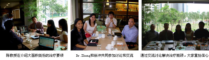 5、7月9日下午3點(diǎn),陳教授再次與PGH(菲律賓總醫(yī)院,菲律賓最大醫(yī)院,2007年引進(jìn)燒傷再生醫(yī)學(xué)技術(shù))的燒傷中心主任、菲律賓燒傷學(xué)會(huì)主席Dr. Glenn Angelo和骨干專家進(jìn)行了深度的學(xué)術(shù)交流。在交流中,陳教授重點(diǎn)講解了大面積特重度燒傷患者的全身系統(tǒng)治療方法和要領(lǐng),尤其是燒傷再生醫(yī)學(xué)與療法與傳統(tǒng)外科干燥植皮技術(shù)在全身系統(tǒng)治療的最大區(qū)別之處。如:大面積燒傷休克期的補(bǔ)液量的計(jì)算和補(bǔ)液的原則;在內(nèi)臟器官功能的保護(hù)和恢復(fù)方面突出強(qiáng)心、保腎的緊急性和重要性等。為該燒傷中心下階段采用再生醫(yī)學(xué)技術(shù)實(shí)現(xiàn)80%~90%燒傷患者的成功救治做好準(zhǔn)備。另外,陳教授還向大家介紹了新產(chǎn)品MEBO創(chuàng)瘍貼和疤痕平的臨床效果和使用方法。通過(guò)這次的深度交流、討論,大家都覺(jué)得受益匪淺,而且也找到了原來(lái)治療大面積燒傷病人失敗的主要原因,增強(qiáng)了大家繼續(xù)采用再生醫(yī)學(xué)技術(shù)治療大面積燒傷的信心。
