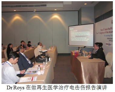 第三位演講者是來自印尼的Dr. Roys A. Pangajoman, 他也是實(shí)踐美寶再生療法的資深醫(yī)生了,曾經(jīng)發(fā)表了一篇應(yīng)用美寶治療電擊傷的臨床論文,這次他的演講內(nèi)容便是針對(duì)一例顱骨嚴(yán)重電擊傷的成功案例。他將運(yùn)用再生醫(yī)學(xué)療法對(duì)此例電擊傷患者治療的詳盡過程跟蹤圖片資料,病人創(chuàng)面的處理演示及愈合情況,生動(dòng)、客觀地展示給了與會(huì)的聽眾,雖然只是一個(gè)病例的展示,但是基于他的病例的嚴(yán)重程度、典型性,以及再生療法在整個(gè)治療中顯示出的優(yōu)勢(shì),都使在場(chǎng)的聽眾為止贊嘆并紛紛提問。