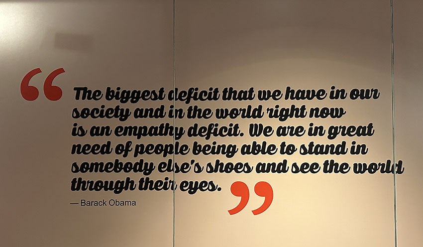 “美國燒傷協(xié)會--鞋子里的一英里”活動是同理心博物館的一個特別項目,通過讓參與者穿上別人的鞋子走幾分鐘,并同時用耳機聽一段燒傷幸存者的故事錄音,獲取同理心和洞察力。館中刻有的美國前總統(tǒng)奧巴馬曾經(jīng)說過的——我們當(dāng)前社會最大的赤字就是同理心赤字。我們非常需要人們能夠站在別人的立場上,通過他們的眼睛看世界——正是此次活動核心價值觀的體現(xiàn)。