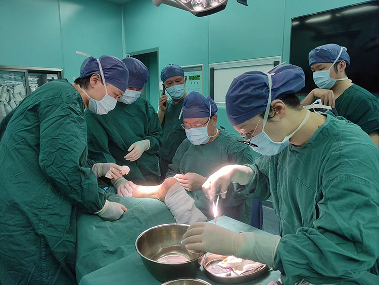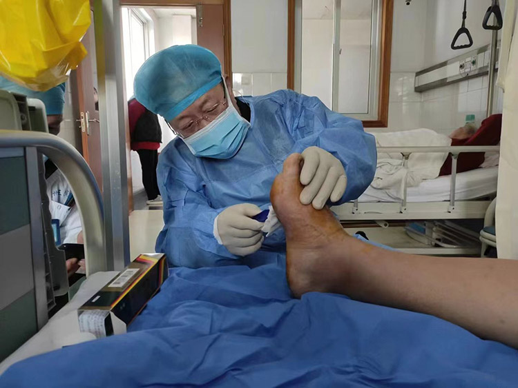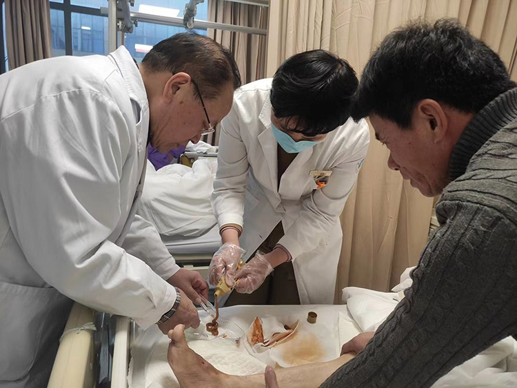 1月29日,《中國燒傷創(chuàng)瘍雜志》常務(wù)編委、燒傷創(chuàng)瘍再生醫(yī)療技術(shù)臨床專家趙瑞慶教授,應(yīng)通州區(qū)第三人民醫(yī)院的再次邀請,運用再生醫(yī)療技術(shù)分別會診了四級糖尿病足潰瘍患者和長期服用抗凝藥物,摔傷后致右下肢脛前皮膚破潰感染的患者。事后與當(dāng)?shù)蒯t(yī)務(wù)人員詳細制定進一步治療計劃,糖足潰瘍患者聽到右足能夠保住的喜訊,流下了感激的淚水。