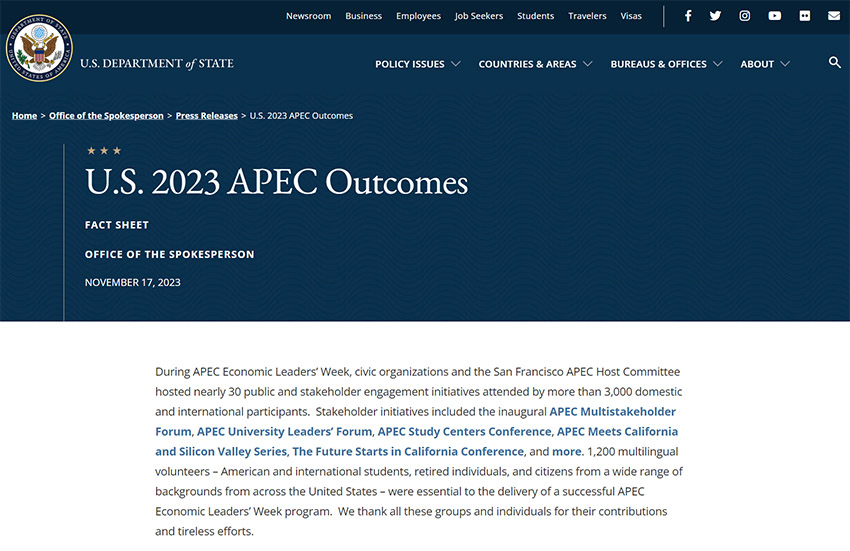 美國(guó)國(guó)務(wù)院發(fā)布2023 APEC成果報(bào)告,灣區(qū)委員會(huì)相關(guān)活動(dòng)列為重要成果
