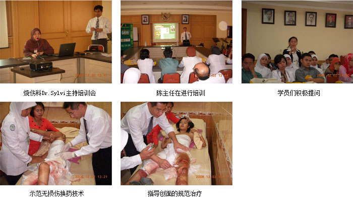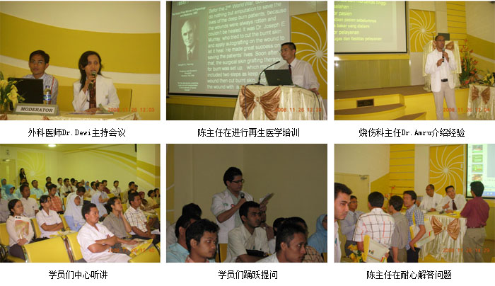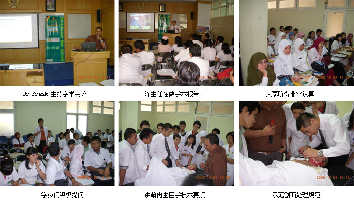 十、2008年12月2日上午,我們到Tangerang City的Tangerang Hospital舉辦培訓(xùn)班,來自全市5家主要醫(yī)院的50多名外科和全科醫(yī)師接受了再生醫(yī)學(xué)技術(shù)的臨床知識培訓(xùn),并解答大家在臨床應(yīng)用中遇到的問題。下午,到該院會(huì)診指導(dǎo)燒傷創(chuàng)面的規(guī)范處理技術(shù)。