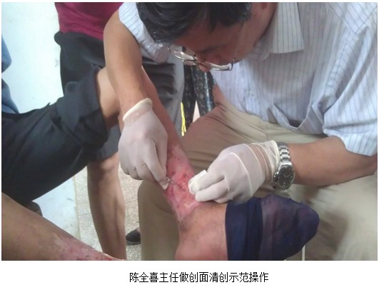 陳全喜主任示范換藥,并詳細說明了技術(shù)操作方法。這次會診使附院醫(yī)生加深加強了對皮膚原位再生醫(yī)療技術(shù)的認識,為再生技術(shù)早日為該區(qū)百姓所用打下了基礎(chǔ)。