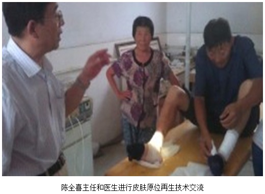患者是一位年近七旬的老人,三個月前做了下肢靜脈曲張手術(shù),術(shù)后刀口不愈合。檢查患者身體無糖尿病及其他并發(fā)癥。陳主任會診后,和全科的四位醫(yī)生共同觀察創(chuàng)面并現(xiàn)場和醫(yī)生進行了學術(shù)交流。陳全喜主任說,創(chuàng)面已形成潰瘍創(chuàng)面,邊沿隆起,肉芽組織老化(纖維化)。這種難愈合性創(chuàng)面只有用皮膚原位再生醫(yī)療技術(shù)來進行治療,才能在短時間內(nèi)使創(chuàng)面愈合。陳主任說:“皮膚原位再生醫(yī)療技術(shù),(體細胞誘導成干細胞,在原位再生皮膚組織器官)能夠提供細胞所需的營養(yǎng)成分,并給創(chuàng)面創(chuàng)造一個良好的濕潤環(huán)境,從而激活了創(chuàng)面的潛能細胞轉(zhuǎn)化為干細胞。在原位再生皮膚組織,創(chuàng)面以生理性再生愈合。