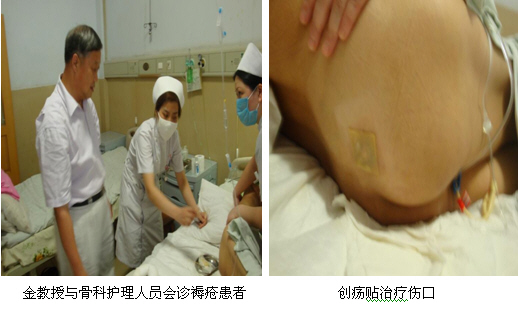 三峽大學仁和醫(yī)院內一科是神經(jīng)內科,呼吸內科和理化中毒的大科,該院郝巧蓉護士長和陳慧敏醫(yī)生熱情地接待了金教授。近期,該科接診了一位淋巴結核創(chuàng)面的老年患者,該患之前在外科住院兩個月,考慮到患者的年齡較大,醫(yī)生未對該患施行手術。目前該患的創(chuàng)面,未有大量分泌物滲出,竇道已封閉。該院在為該患治療時,曾用過安福消炎膏,龍血竭粉外敷于創(chuàng)面,效果不理想,后改用美寶創(chuàng)瘍貼和濕潤燒傷膏換藥已有一個多月。金教授仔細查看了該患創(chuàng)面,創(chuàng)面有供血,但無滲液,金教授建議患者的主治醫(yī)生繼續(xù)使用美寶創(chuàng)瘍貼和濕潤燒傷膏聯(lián)合換藥,并講解了換藥時的注意事項。