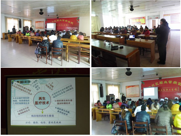 金黨軍教授針對(duì)醫(yī)院的情況,重點(diǎn)圍繞慢性皮膚潰瘍的治療技術(shù),從濕性燒傷治療技術(shù)開(kāi)始講解燒燙傷創(chuàng)面的換藥原則和方法,并提醒大家,燒燙傷創(chuàng)面換藥的方法貫穿所有慢性皮膚潰瘍,如壓瘡、糖尿病足、脈管炎引起的皮膚潰瘍等等常見(jiàn)創(chuàng)面;金黨軍教授還講述了清理創(chuàng)面遵循的三個(gè)原則,并結(jié)合實(shí)例臨床圖片,詳細(xì)講解了美寶再生醫(yī)療技術(shù)的理論和實(shí)踐。整個(gè)培訓(xùn)班進(jìn)行了兩個(gè)小時(shí),醫(yī)生們都表示收獲很多,對(duì)美寶再生醫(yī)療技術(shù)有了初步認(rèn)識(shí)。住院部一樓的付護(hù)士長(zhǎng)還專門請(qǐng)金老師到科室會(huì)診一位褥瘡患者,金老師會(huì)診后提出了治療方案,并結(jié)合剛剛課堂上講的方法,給病房護(hù)理人員講解再生技術(shù)臨床實(shí)踐的注意事項(xiàng)等。