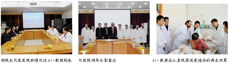 17日上午9時,Dr. Ali在中國燒傷創(chuàng)瘍科技中心臨床部陳永翀主任和醫(yī)學(xué)英語專業(yè)翻譯張印的陪同下來到了泰山醫(yī)學(xué)院附屬醫(yī)院,醫(yī)院業(yè)務(wù)副院長胡建功教授和醫(yī)務(wù)處楊曉雯處長在醫(yī)院的多功能廳舉辦了簡短的歡迎儀式,熱情歡迎Dr.Ali來到泰山醫(yī)學(xué)院附屬醫(yī)院進(jìn)行參觀考察和學(xué)術(shù)交流。歡迎儀式結(jié)束后,按照原定計(jì)劃,Dr.Ali在燒傷科徐西勝主任和護(hù)士長的帶領(lǐng)下參觀考察了燒傷科病房及住院處的各種燒傷、創(chuàng)瘍患者的治療情況,目前燒傷科住院患者有26名,其中大面積燒傷有7名。Dr.Ali重點(diǎn)參加了5例大面積燒傷患者的不同治療階段的查房和病例討論,還觀摩了為2例大面積燒傷患者示范換藥的過程。在病房的參觀考察過程中,Dr.Ali一直都非常興奮和激動,他不停地向患者和家屬打招呼,不停地提問、拍照和檢查再生愈合后的皮膚質(zhì)量,Dr.Ali感慨地講道,他曾經(jīng)到過美國和歐洲的世界上最好的燒傷中心參觀和考察,雖然他們的病房條件很好,但住院燒傷患者的救治成活率還達(dá)不到70%,而且在那里患者與家人被無情地分開,單獨(dú)隔離到一個完全陌生和封閉的環(huán)境里,他所見到的患者都是神情緊張、目光呆滯或情緒低落,患者每天都在驚恐中度日如年。今天,Dr.Ali看到采用燒傷再生醫(yī)學(xué)技術(shù)治療的大面積深度燒傷患者卻能夠在普通、開放的病房里接受治療,在這里所看到的患者都是神情自若、精神飽滿、情緒穩(wěn)定、能吃、能動、能睡,還能夠和家人、朋友進(jìn)行交談,換藥中還能夠配合醫(yī)師進(jìn)行翻身、抬腿等,而且整個病區(qū)沒有發(fā)現(xiàn)1例創(chuàng)面感染的患者。Dr.Ali 忍不住驚呼:燒傷再生醫(yī)學(xué)技術(shù)太神奇了!中國的燒傷醫(yī)師、護(hù)士太偉大了。
